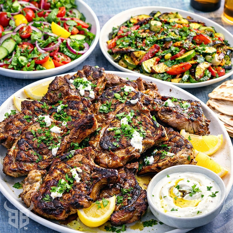 BBQ FOREQUARTER LAMB CHOP PLATTER. Yoghurt Marinade with Fresh Salads