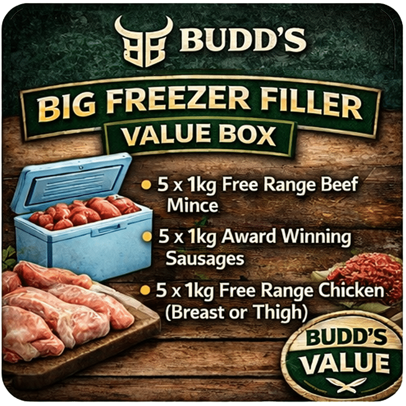 That’s 15kg of quality meat from the Budd’s butchers, all packed in handy 1kg portions ready to freeze, thaw and cook whenever you need them.