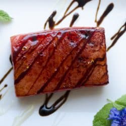 Drizzle 1 tsp of honey and 1/2 Tbsp balsamic reduction over each steak. Top each with a dash of chopped fresh mint, a sprinkle of crumbled feta cheese, and a few edible flowers.